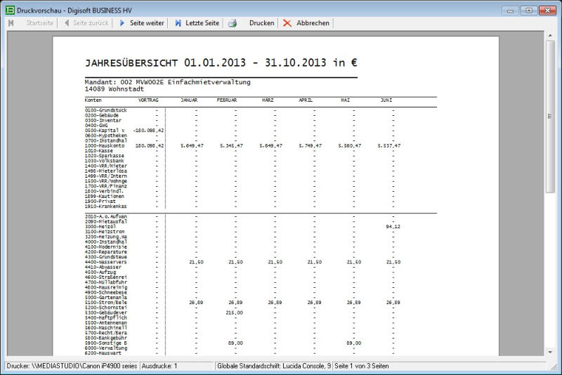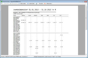 Ausdruck Hauptjahresübersicht mit Vorträgen, allen Monatssalden, Jahressalden und Endbeständen
